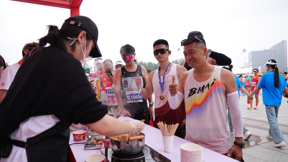 这里从早上鸣枪后就排起了长队,张亮麻辣烫就成为最受欢迎的补给站点之一。工作人员热情接待每一位来宾,还特别发放了专属“显眼包”礼品,将现场气氛推向高潮。这场别开生面的“赛道流水席”,以美味点亮了整个马拉松赛道,成为赛事中独具特色的美食狂欢。